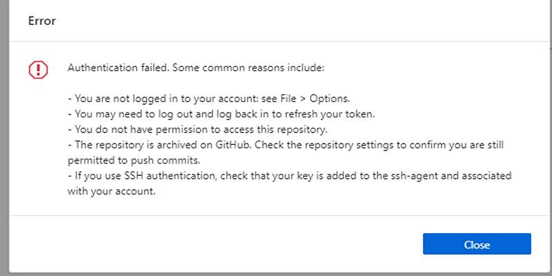 Authentication errors occur when GitHub can’t verify that you have permission to push to a repository. This could be due to: